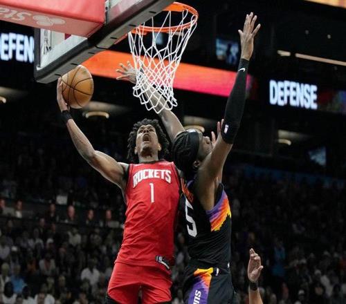 次节较量,小贾、申京先后失误,古德温轰进远投,阿隆霍勒迪外线取分。格林、申京各有连续失误,伊森补篮打进,霍勒迪又中三分球,菲尼克斯请求暂停。吉莱斯皮失误,泰特补篮得手,火箭打出了10比0的攻势。狄龙与杜兰特各有跳投取分,布克单打命中,随后吃到技术犯规,杜兰特罚球命中。小贾轰进远投,泰特技术犯规,布克罚球命中。