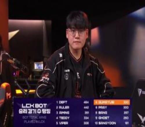 电竞体育4月8报道 在今日的LCK第二赛段比赛上,HLE以2-0的比分击败DK,赛后官方数据显示Gumayusi拿下300胜,在LCK AD位列第六名!