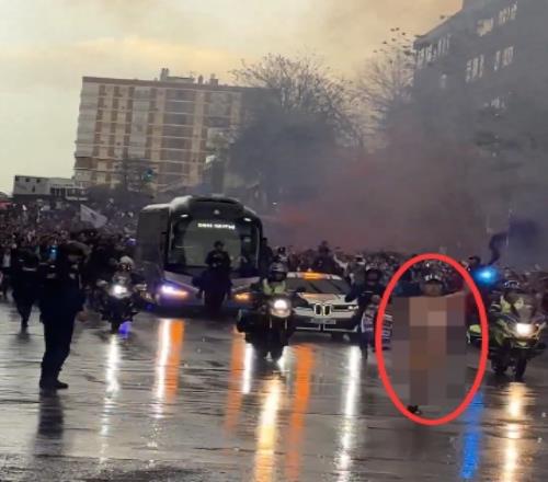 据TA记者Guillermo Rai在现场的拍摄,皇马大巴在球迷的簇拥中前往伯纳乌球场,而大巴前还跑过一名裸男。