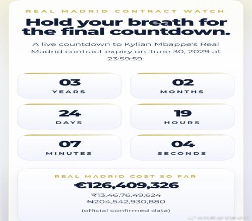 皇马球迷专门做了一个网站,实时倒计时姆巴佩与皇马的合同到期时间(2029年6月30日23:59:59)以及花费成本